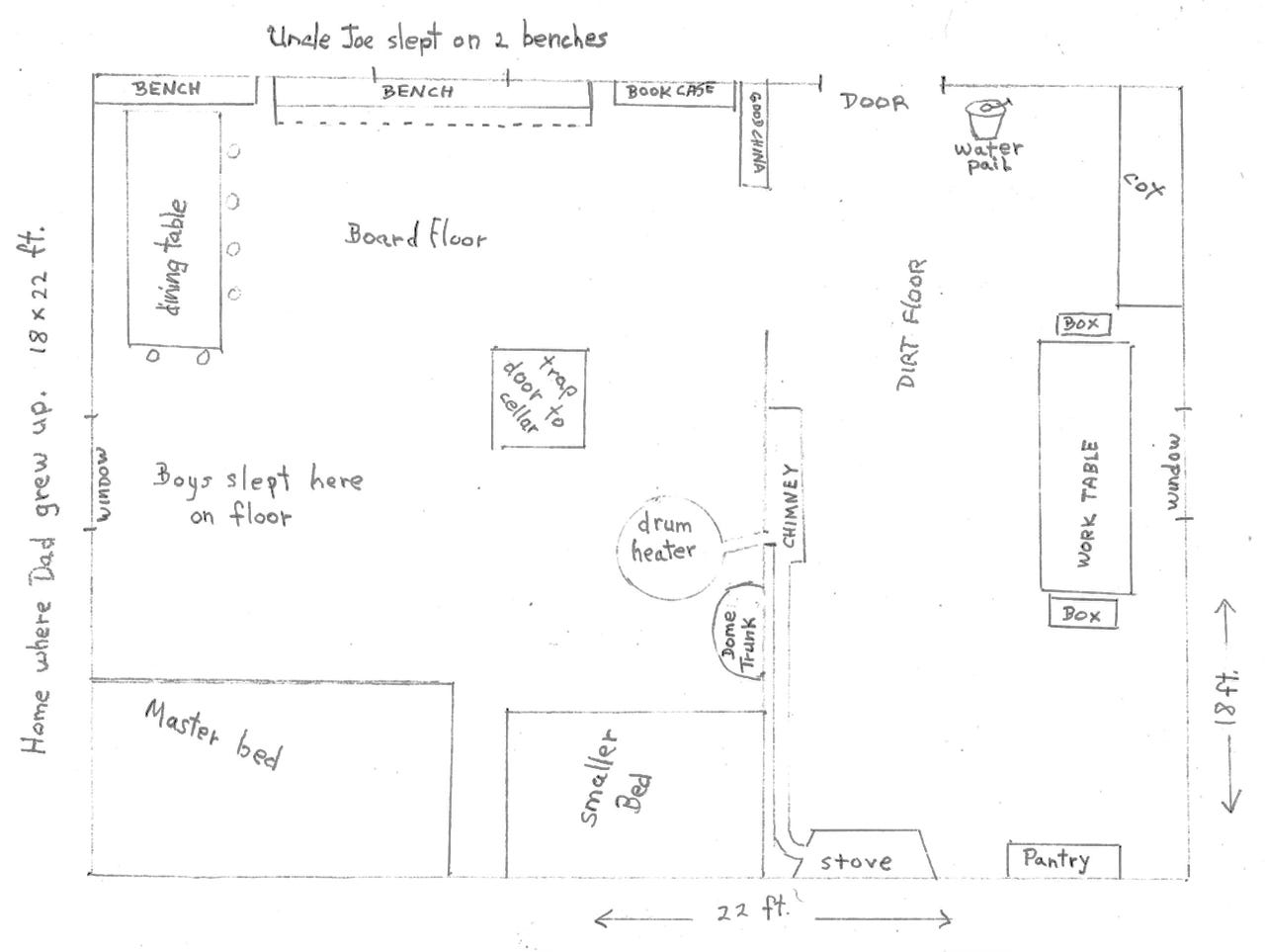 From the vantage point of 90-plus years, Peter, the second-eldest son, remembered in meticulous detail the house in which he grew up. He and his daughter Donna made a schematic drawing of it. There were two rooms, a dirt floor in the kitchen and board flooring in the larger room, used for dining, sleeping and socializing. A drum heater on the living-room side of the interior wall and a stove in the kitchen were connected to the chimney. Heating and cooking were entirely with wood. I’m guessing that Julian slept on the cot in the kitchen. Everyone else slept in the main room, the boys mostly on the floor.